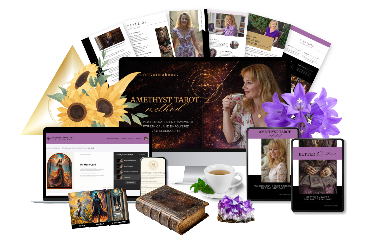 First, youâll dive into the Amethyst Tarot Method Training Module, where I teach you my 5-step framework for confidently reading any card in any spread without memorizing endless keywords. Then, youâll unlock your Amethyst Tarot GPTÂ - an AI powered practice and client support partner that helps you reframe disempowering questions, generate custom spreads for real-world issues, and walk through card interpretations step by step.Â